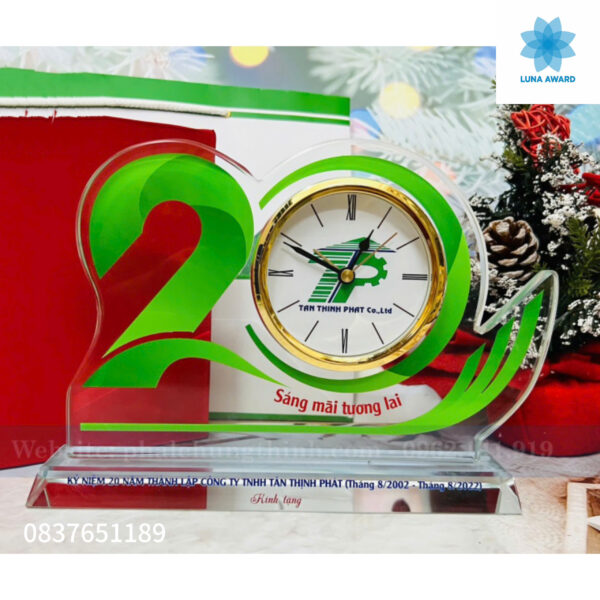 Trong bất kỳ công ty, doanh nghiệp hay tổ chức nào việc kỷ niệm các mốc thời gian quan trọng như 20 năm thành lập là một dịp vô cùng ý nghĩa. Để đánh dấu sự kiện này, một trong những lựa chọn về quà tặng lưu niệm phổ biến và trang trọng nhất chính là sử dụng kỷ niệm chương pha lê. Với mẫu Kỷ niệm chương pha lê LA-K04 kỷ niệm 20 năm thành lập công ty, chất liệu pha lê kèm đồng hồ mạ đồng cao cấp tạo nên sản phẩm kỷ niệm chương chất lượng cao, vừa thẩm mỹ lại bền đẹp theo thời gian.
